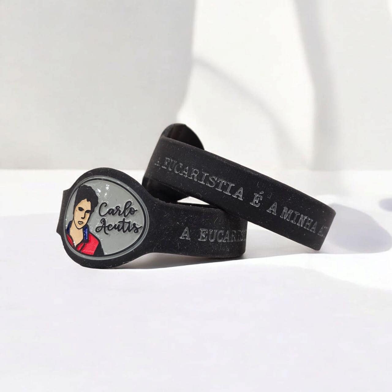 Pulseira em silicone com a imagem do Beato Carlo Acutis e a frase em relevo: