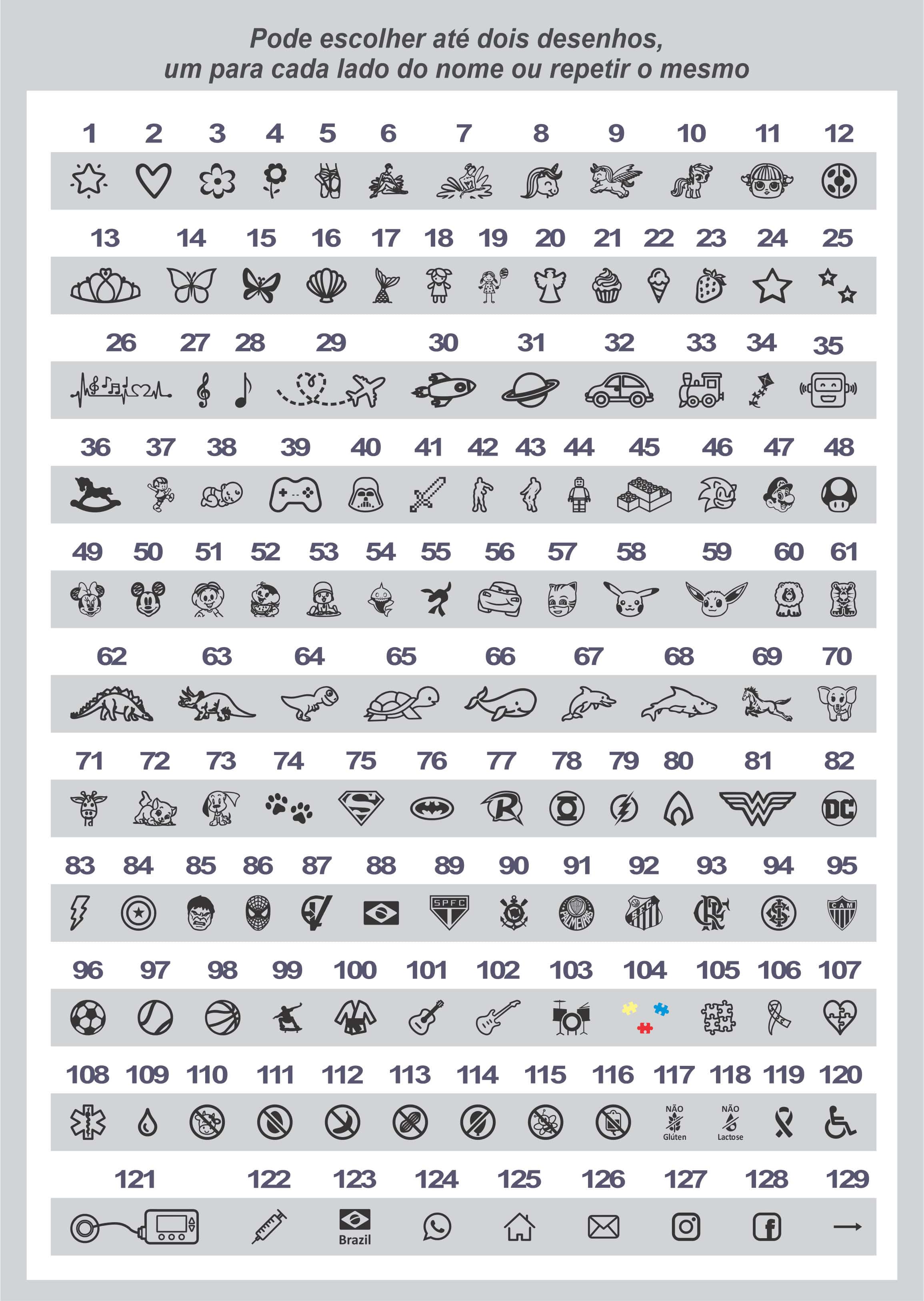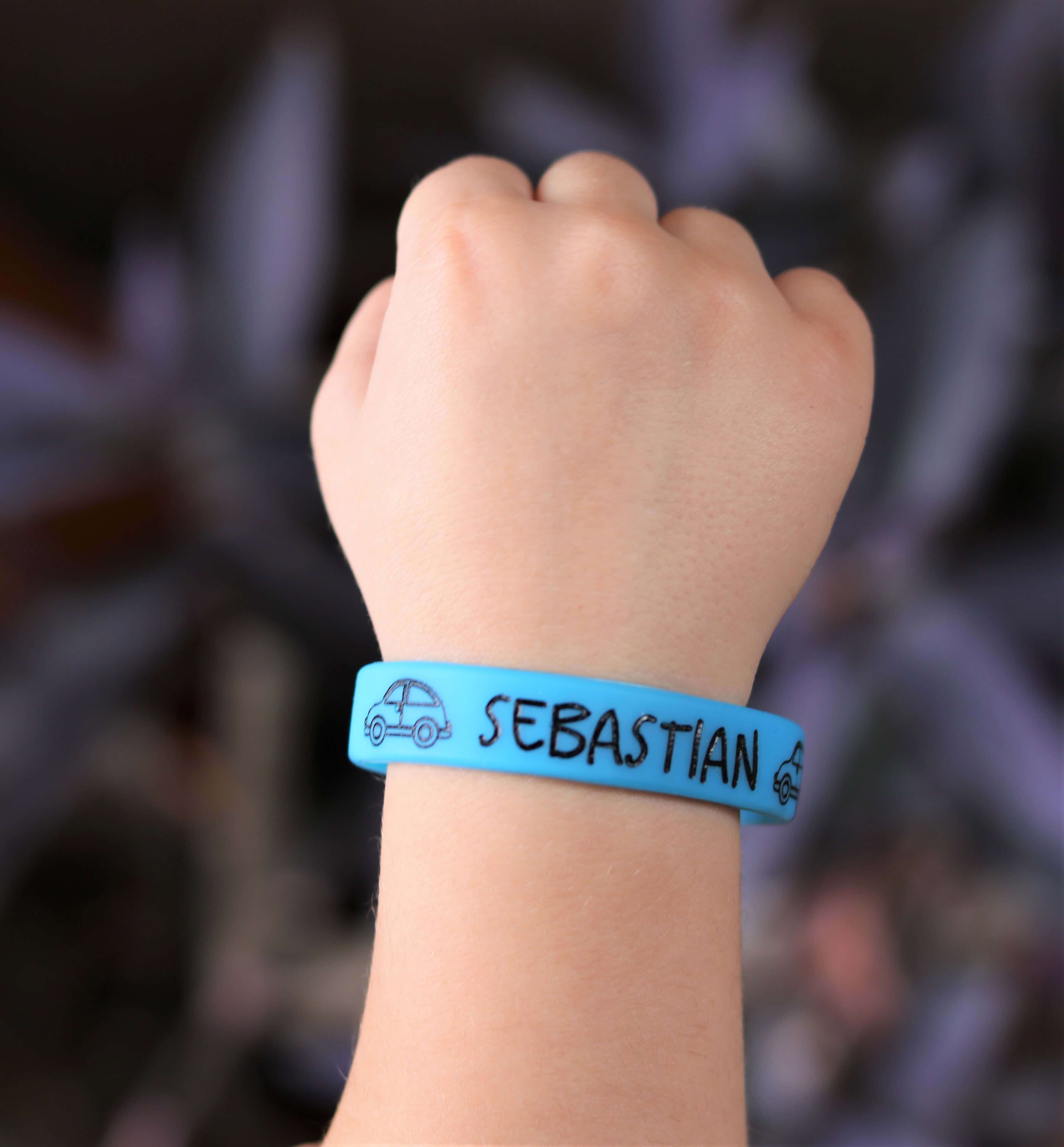 Pulseira de identificação infantil personalizada com o nome da sua criança, desenhos e telefone dos pais (na parte interna ou externa da pulseira, como preferir).