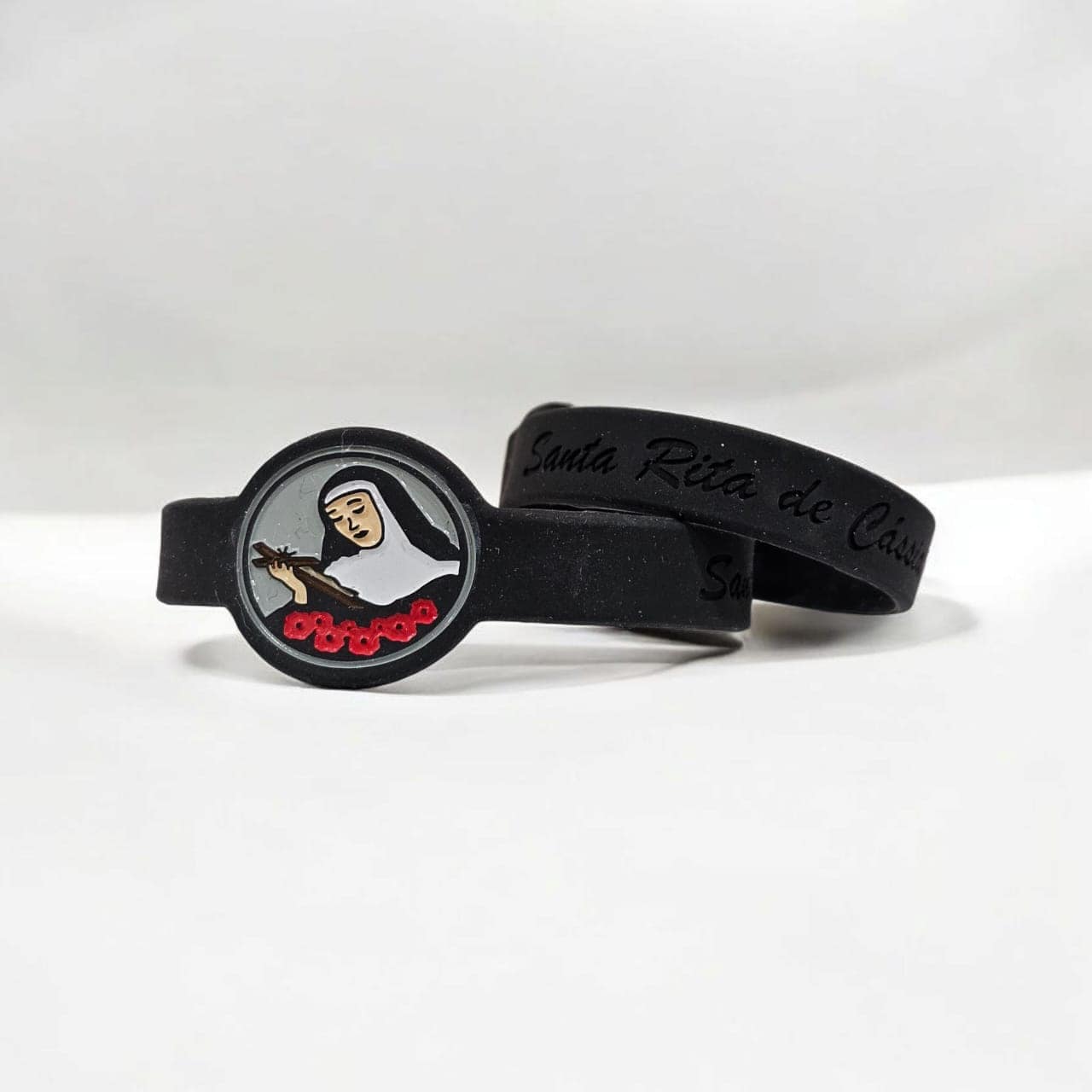 Pulseira em silicone com a imagem de Santa Rita de Cássia, conhecida como a santa das causas impossíveis.