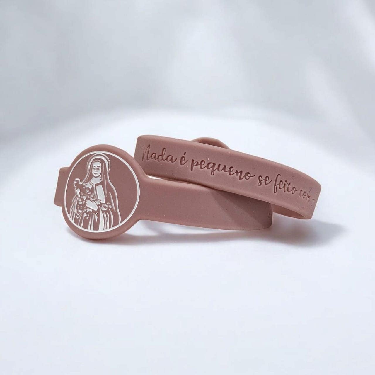 Pulseira em silicone com a imagem de Santa Teresinha do Menino Jesus e a frase “Nada é pequeno se feito com amor”.